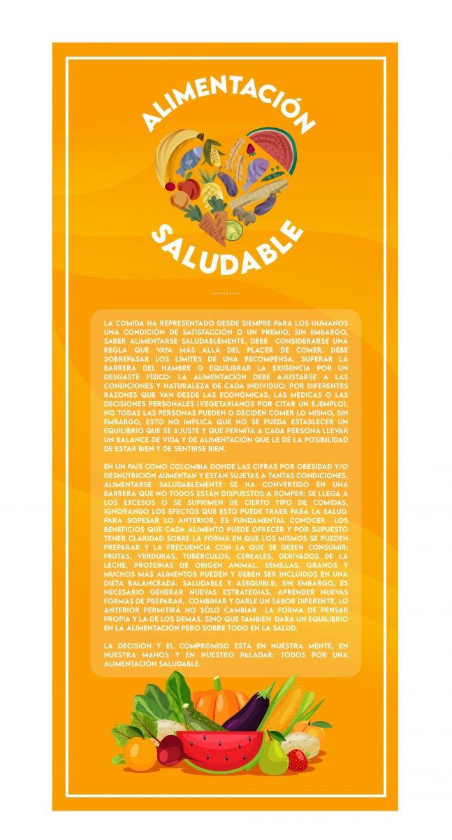 La alimentación saludable es aquella que aporta a cada individuo todos los alimentos necesarios para cubrir sus necesidades nutricionales, en las edades acorde a su ciclo vital (primera infancia, infancia, adolescencia, juventud, adultez y vejez), y en de acuerdo a diagnósticos o enfermedades.