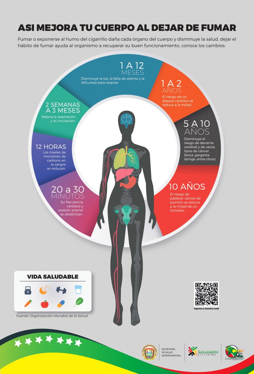 Asunto de reflexión y acción …. ¿Sabías que la nicotina es tan adictiva como la cocaína y la heroína?, conoce en la infografía los beneficios para el cuerpo y los cambios en su funcionamiento a través del tiempo, al reducir o eliminar el consumo de tabaco.